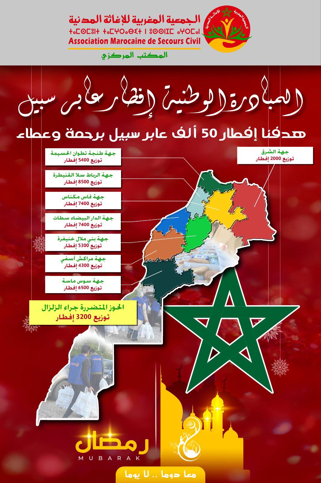 في إطار أنشطتها السنوية الكبرى، وترسيخا لمبادئ التضامن والتكافل التي تطبع خصال المغاربة قاطبة، تنظم الجمعية المغربية للإغاثة المدنية، الحملة الوطنية لمبادرة إفطار عابر سبيل في نسختها 11 بكل ربوع المملكة.